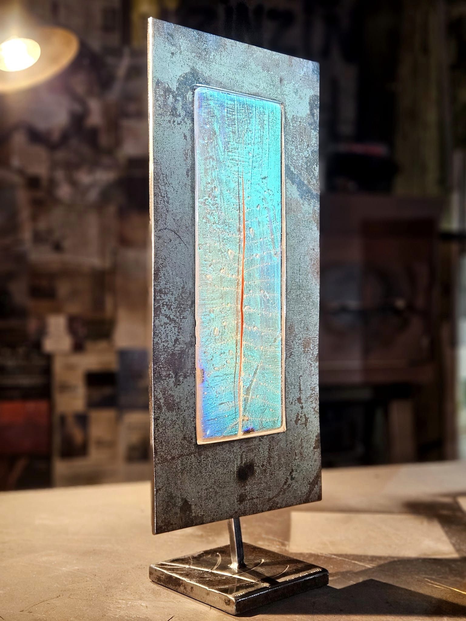 Végétal inclu dans la cuisson de verre dichroïque thermoformé et acier.